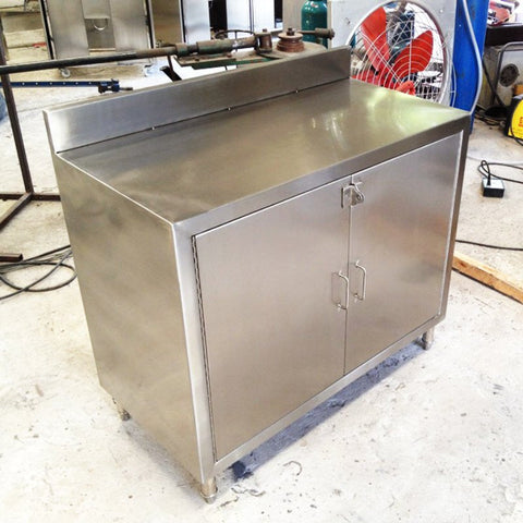 Cabinets: For years we have crafted numerous cabinet designs of all sizes for working kitchens and behind front counters. Tell us what would meet your requirements; size, how many shelves, configuration of shelves, height of back splashes if setting close to wall, open front, closing door front with, or without ability to lock. Just let us know what you need, together we’ll work it out and produce the quality equipment you desire, expect.